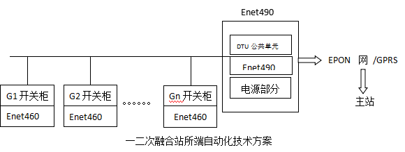 Enet490 一二次融合DTU公共單元和Enet460一二次融合三遙動作型DTU間隔單元組成了一二次融合智能分布式DTU的實現(xiàn)方案: