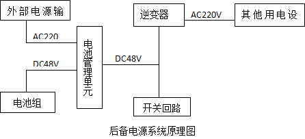 正常供電時,由外部電源輸入,經(jīng)過電池管理單元提供開關(guān)的控制和操作電源,同時經(jīng)過逆變器,給網(wǎng)絡設備、視頻等其他用電設備等供電。外部電源同時給電池組充電;外部電源失電時,由電池組通過電池管理單元自動接續(xù),給開關(guān)回路和其他用電設備供電。