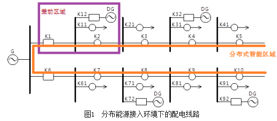 圖1是分布能源接入環(huán)境下的配電線路的典型結(jié)構(gòu)圖。引入?yún)^(qū)域差動保護(hù)技術(shù)之后,保護(hù)定值針對一個(gè)區(qū)域,根據(jù)基爾霍夫電流定律,針對一個(gè)區(qū)域ΣI=0,理論上,任何環(huán)境下的區(qū)域保護(hù)定值都是0。實(shí)際的保護(hù)定值應(yīng)該是大于0的某一個(gè)值Id。這個(gè)Id和區(qū)域無關(guān),只和ΣI中各個(gè)分量采樣和計(jì)算誤差有關(guān)。亦即,常規(guī)型FA技術(shù)中,保護(hù)定值調(diào)整困難和無法設(shè)置的問題在區(qū)域差動保護(hù)技術(shù)完全不存在了。