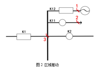 考慮圖2中的典型差動區(qū)域,可能故障點(diǎn)有三處。位置1發(fā)生故障時(shí),K12速斷跳開,完成故障隔離。位置2發(fā)生故障時(shí),k12過流但方向閉鎖不跳,k11過流速斷跳開,完成故障隔離。